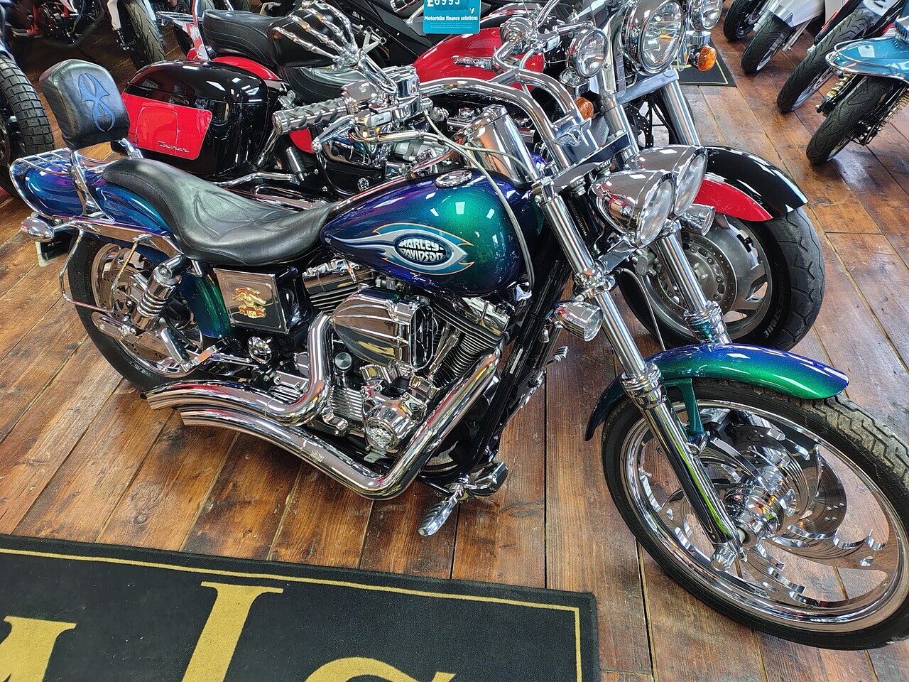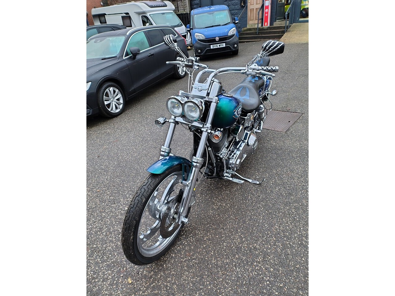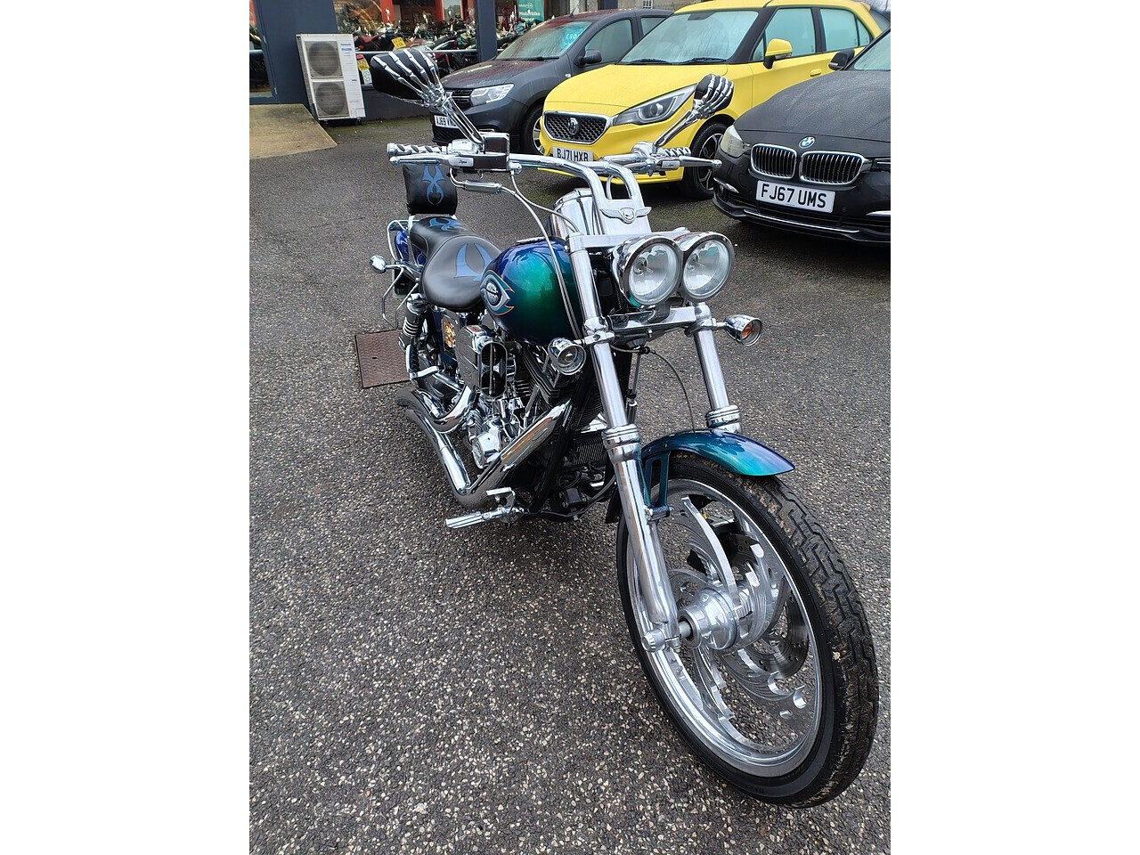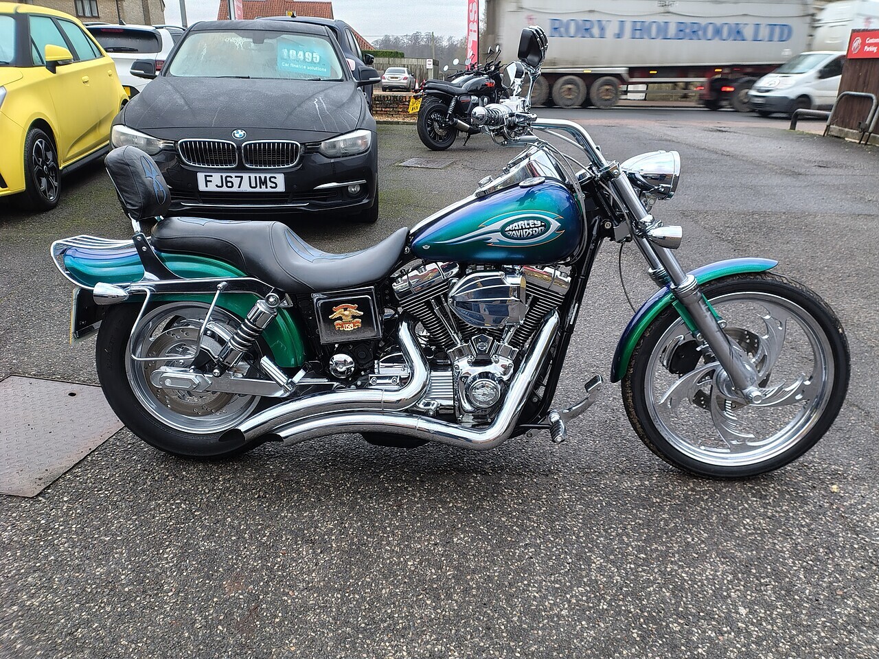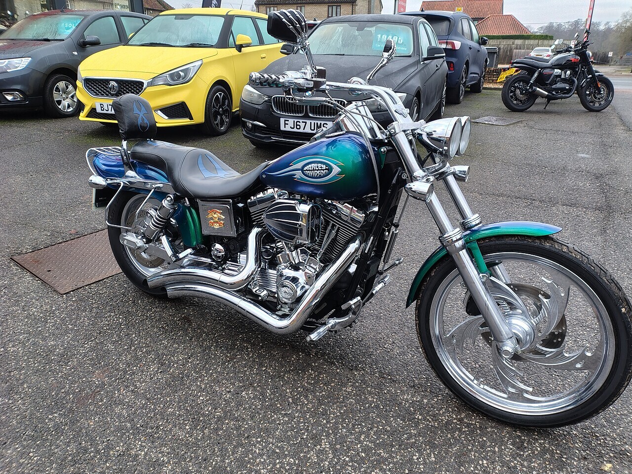 2003 53 Plate Harley Davidson Dyna Wide Glide FXDWG Custom in Blue Green Flip Paint and only 4454 Miles and 2 Owners From New. This machine is stunning throughout with over £8000's worth of Harley Genuine Custom Parts.